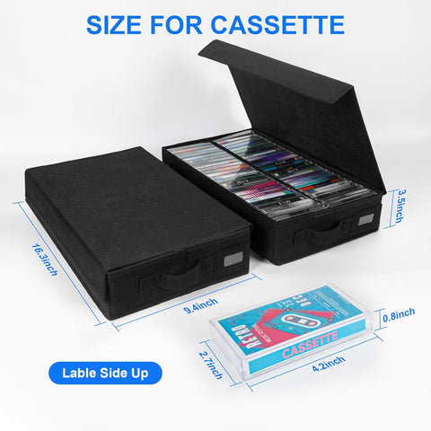 USED "BLACK" cassette Tape Storage Box with Handles and Lid – Cassette Tape Holder and Organizer with External Label Slots, Stackable Cassette Storage Rack